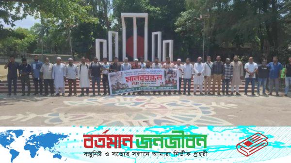 আজ বুধবার সকালে কেরানীগঞ্জ উপজেলা শহীদ মিনার চত্বরে ঘন্টাব্যাপী এ মানববন্ধন অনুষ্ঠিত হয়। মানববন্ধনে অংশ নেন কেরানীগঞ্জ প্রেসক্লাবের নেতৃবৃন্দসহ বিভিন্ন শ্রেণি-পেশার মানুষ ও সামাজিক সংগঠনের প্রতিনিধিরা। বিক্ষুব্ধ স্লোগানে স্লোগানে মুখরিত হয়ে ওঠে শহীদ মিনার এলাকা।